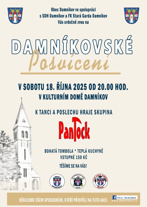Obec Damníkov ve spolupráci s SDH a FK Stará Garda Damníkov vás srdečně zvou v sobotu 18. října od 20 hodin na Damníkovské posvícení.