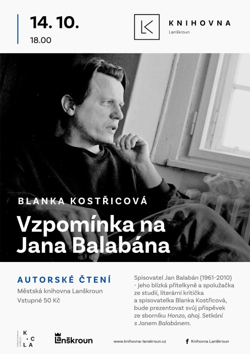 Jeho blízká přítelkyně a spolužačka ze studií, literární kritička a spisovatelka Blanka Kostřicová, bude prezentovat svůj příspěvek ze sborníku Honzo, ahoj. Setkání s Janem Balabánem, který vyšel v roce 2011, k autorovým nedožitým padesátinám. Vstupné 50 Kč.