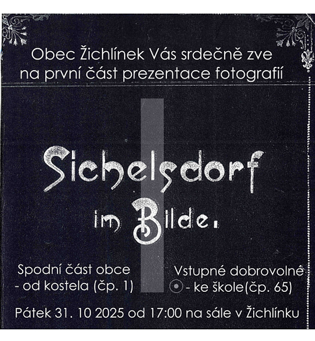 Obec Žichlínek vás srdečně zve na první část prezentace fotografií Sichelsdorf im Bilde I./ Žichlínek v obrazech I. s podtitulem „Od kostela ke škole".