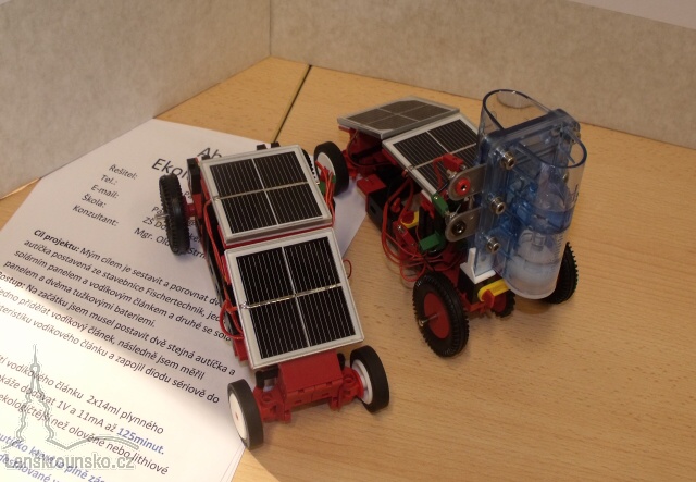 (7) Ekologické auto (Jan Pavlas). Porovnání provozních vlastností dvou stavebnicových modelů autíček, jednoho poháněného vodíkovým článkem a druhého s tužkovými bateriemi.