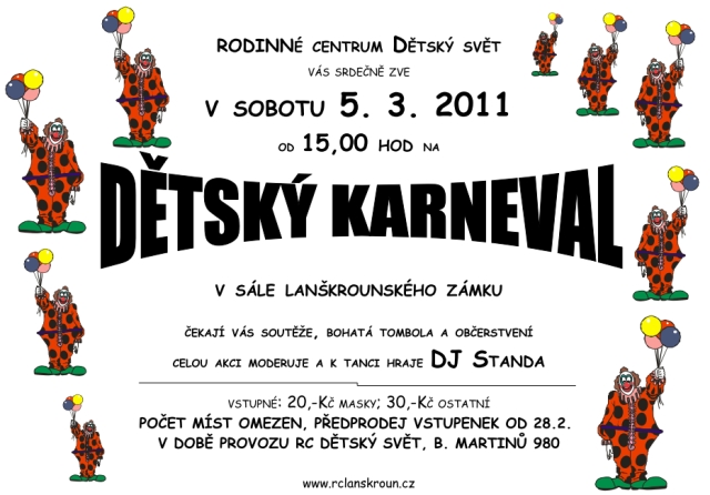 Rodinné centrum Dětský svět vás srdečně zve v sobotu 5. března od 15 hodin na DĚTSKÝ KARNEVAL. V sále lanškrounského zámku vás čekají soutěže, bohatá tombola a občerstvení. Akci moderuje a k tanci hraje DJ Standa. Vstupné: masky 20 Kč, ostatní 30 Kč. Počet míst je omezen, předprodej vstupenek probíhá již od 28. 2. v rodinném centru Dětský svět na ul. B. Martinů 980 (v době provozu RC).
