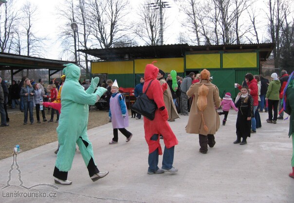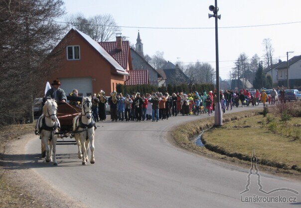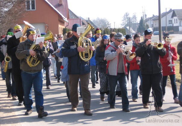 Ve 12.30 vyrazil průvod maškar za doprovodu dechové kapely Letohradská 13 až na konec vesnice a přes obě sídliště zpět na hřiště.