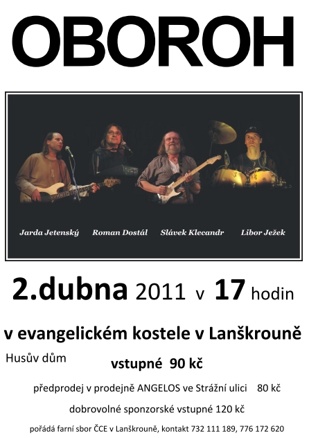 Folkrocková skupina OBOROH vystoupí v sobotu 2. dubna 2011 od 17 hodin v evangelickém kostele (Husův dům) v Lanškrouně. Cena vstupenek je 90 Kč, v předprodeji je můžete koupit v prodejně Angelos ve Strážní ulici za 80 Kč. Dobrovolné sponzorské vstupné je 120 Kč. Koncert pořádá farní sbor ČCE v Lanškrouně, kontaktní tel. 732 111 189 a 776 172 620.