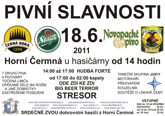 U hasičárny v Horní Čermné proběhnou v sobotu 18. června od 14 hodin pivní slavnosti. Ochutnat budete moci 7 druhů piva ze 7 pivovarů. Na rožni se bude opékat sele. K tanci a poslechu bude hrát živá hudba.