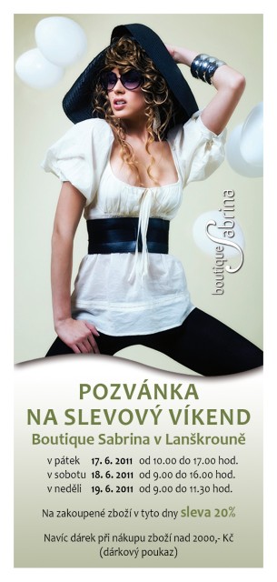 V Boutique Sabrina v Lanškrouně bude tento víkend (od pátku 17. 6. do neděle 19. 6.) slveva na zakoupené zboží 20%. Navíc při nákupu zboží nad 2 000 Kč dostanete dárkový poukaz.