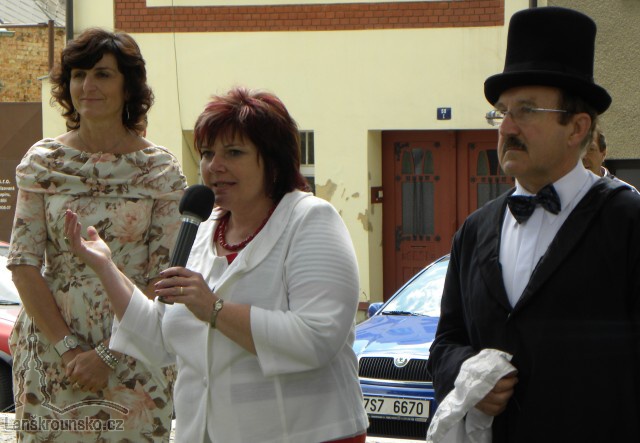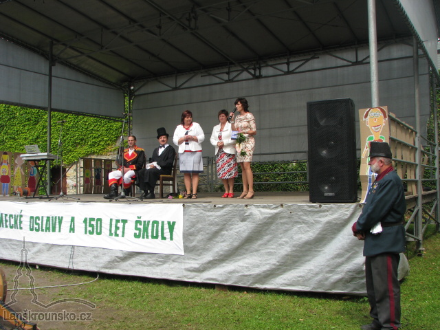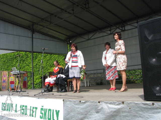 Gratulace k výročí školy a přání do dalších let symbolicky mířila k ředitelce Mgr. Monice Duškové. Zajímavý moment nastal, když jí ředitelka městského muzea PaedDr. Marie Borkovcová společně se starostkou Mgr. Stanislavou Švarcovou věnovaly dárek. A protože se v psychologii učily, že základní taktikou výchovy je cukr a bič, skutečně Monice Duškové předaly krabici kostkového cukru a bičík. Ta konstatovala, že se bude snažit používat pouze cukr, bič jenom ve formě slovní výhrůžky. „Přeji naší škole nejmíň dalších 150 let. Přeji jí velmi vnímavé žáky, přeji jí trpělivé a důsledné učitele, samozřejmě vstřícné rodiče, a aby to školní prostředí bylo především příjemné,“ popřála nakonec škole Monika Dušková.