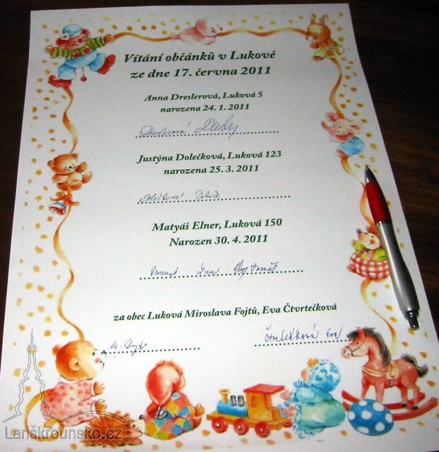 Noví občánci Lukové byli přivítáni v pátek 17. června 2011 v Lukové. S malou Justýnkou, Andulkou a Tobiáškem přišlo na tento malý slavnostní obřad tolik příbuzných a známých, že byla zasedací síň úplně zaplněna. Kromě starostky obce a členky kulturní komise paní Evy Čtvrtečkové přišly své nové mladší kamarády přivítat také Liduška, Pavlínka a Agátka z mateřské školy, s nimiž paní učitelka Kateřina Vašíčková nacvičila velmi hezké vystoupení.