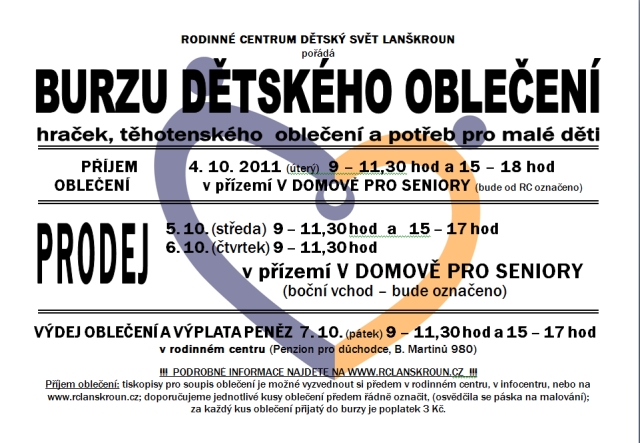 Rodinné centrum Dětský svět zve veřejnost na BURZU DĚTSKÉHO OBLEČENÍ, HRAČEK, TĚHOTENSKÉHO OBLEČENÍ A POTŘEB PRO MALÉ DĚTI, která se koná od 4. do 7. října v přízemí Domova pro seniory. Podrobnosti jsou uvedeny na přiloženém plakátku.