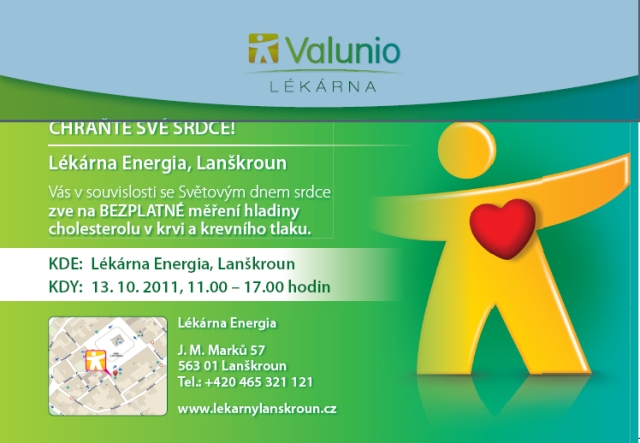 V souvislosti se Světovým dnem srdce zve lékárna Energia lanškrounskou veřejnost na BEZPLATNÉ měření hladiny cholesterolu v krvi a změření krevního tlaku. Akce se uskuteční ve čtvrtek 13. října od 11 do 17 hodin v prostorách lékárny Energia na náměstí J. M. Marků.