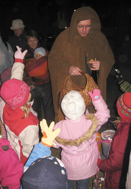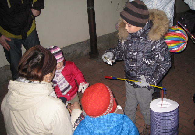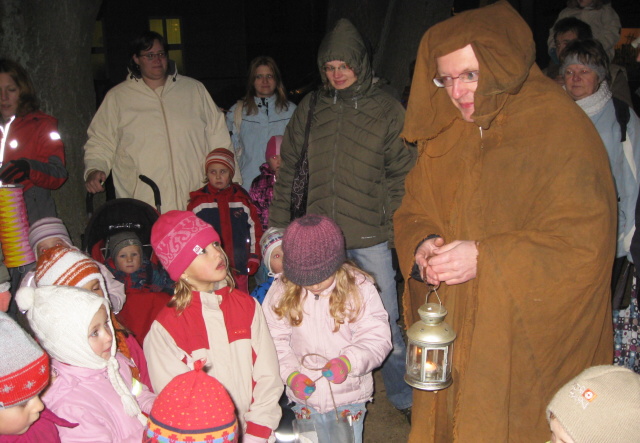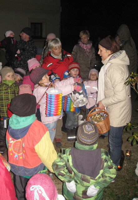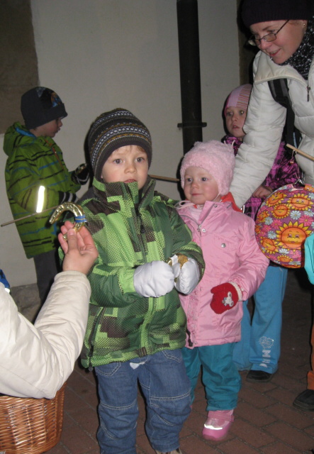 Potom si pohladily žebrákův kouzelný plášť a mohly se vydat za světýlky vedoucími k pokladu. Ta je přivedla až před galerii muzea, kde byl poklad ukryt. Děti zazpívaly písničku o světýlkách, kterou se naučily v rodinném centru a připomněly si legendu o svatém Martinovi. Ze sladkého pokladu si každé z dětí domů odneslo čokoládovou podkovičku.