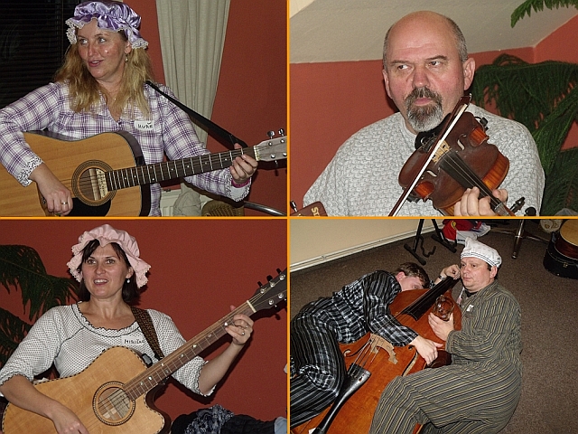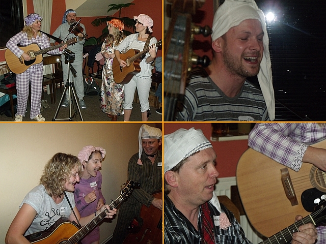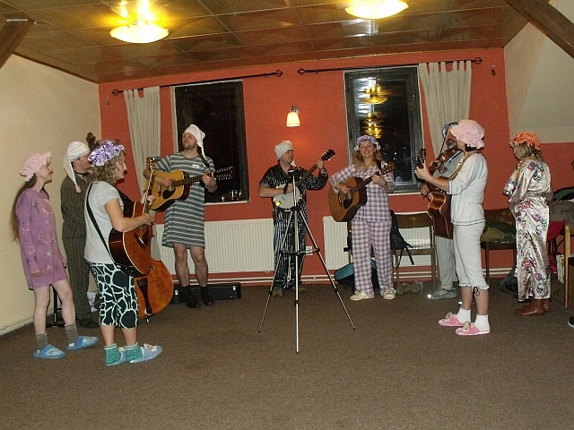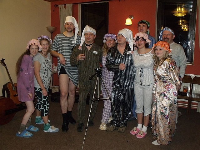Celou akci zorganizovali Jirka Skalický a Jiřina Vosátková. V 19 hodin nebylo ještě jasné, jak to všecko dopadne, na devět hudebníků (také v pyžamech) jsme napočítali ani ne dvakrát tolik hostí – žádná sláva. Ale další přicházeli, i mezi osmou a devátou, a nakonec byl salonek plný.
