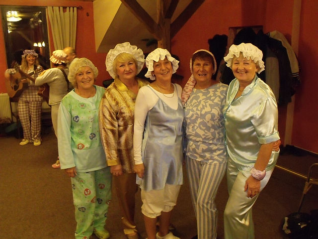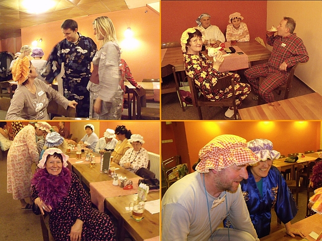 Z nápadného nočního oblečení někdy až přecházel zrak a jako doplněk ještě Marta Vicanová s Jiřinou Vosátkovou ušily slušivé dámské a pánské čepičky pro ty, co na pokrývku hlavy zapomněli.