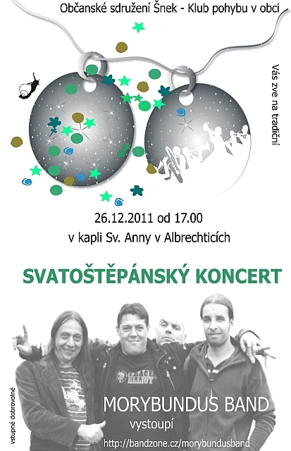 Koncert opět pořádá pro místní i okolní posluchače albrechtické občanské sdružení Šnek - Klub pohybu v obci, pečlivě se starající i o jejich pohodlí před a po koncertu. Vynikající akustika církevní stavby přispívá k silnému hudebnímu zážitku.Kapela MORYBUNDUS BAND si již získala dobré jméno jak na Lanškrounsku, tak i v širším okolí. Jsou to čtyři hudebníci, které vidíme i na plakátu svatoštěpánského koncertu
