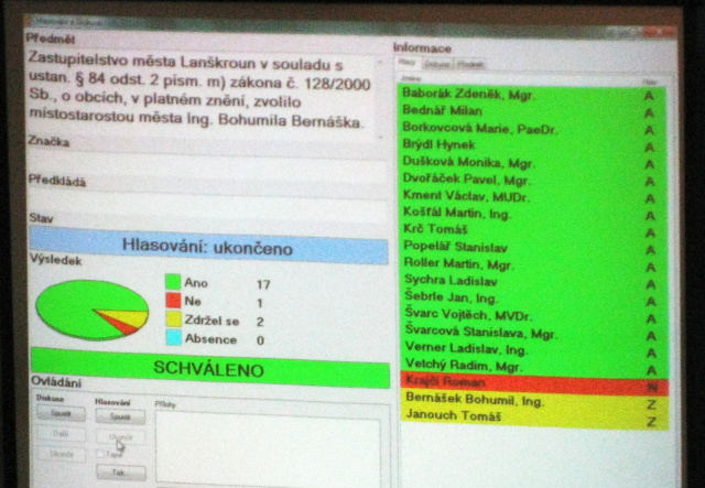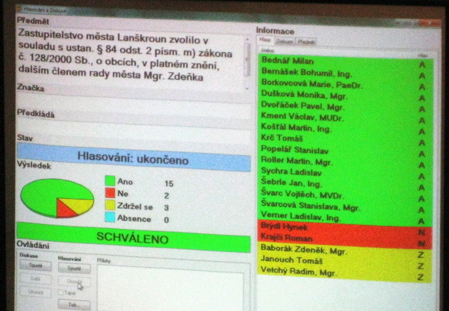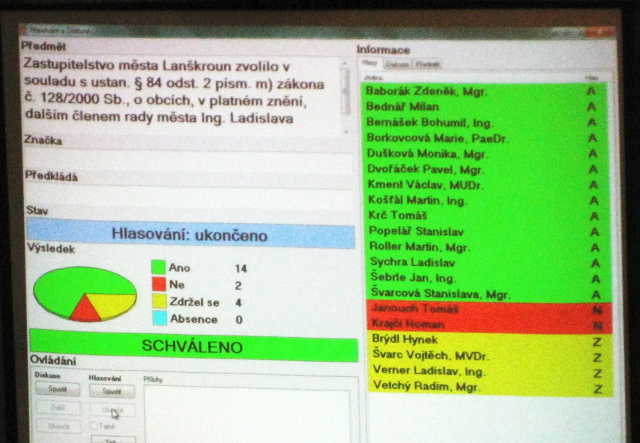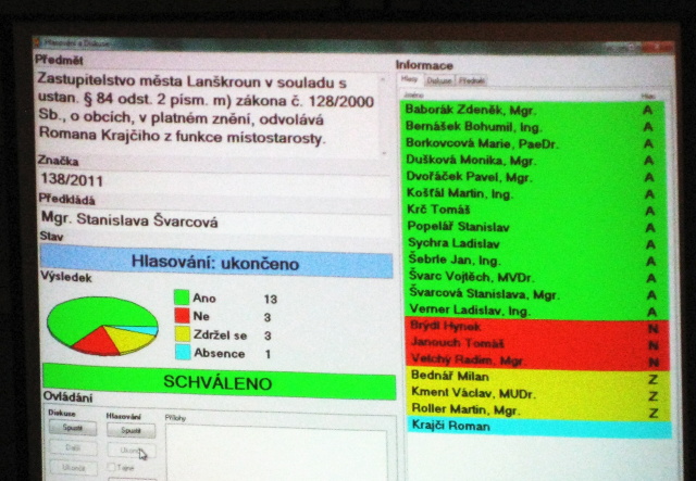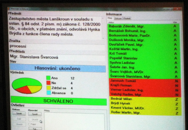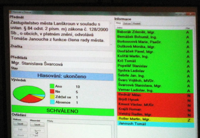 Poslední letošní jednání zastupitelstva potvrdilo, že dosavadní koalice ODS, MůjLanškroun a TOP 09 v Lanškrouně končí. Starostka města hned v úvodu navrhla odvolat ze sedmičlenné rady města všechny zástupce sdružení MůjLanškroun - Hynka Brýdla, Tomáše Janoucha a dosavadního místostarostu Romana Krajčiho.