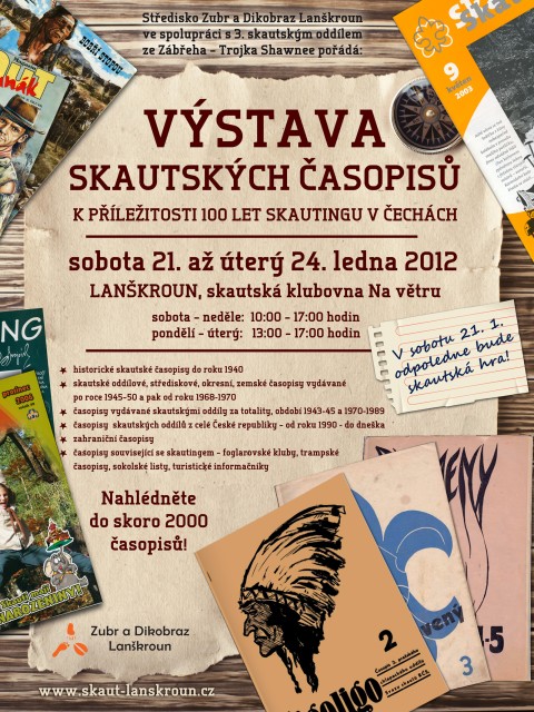 Středisko Zubr a Dikobraz Lanškroun ve spolupráci s 3. skautským oddílem ze Zábřeha - Trojka Shawnee pořádá výstavu skautských časopisů k příležitosti 100 let skautingu v Čechách. Výstava se uskuteční od soboty 21. do úterý 24. ledna ve skautské klubovně Na větru v Lanškrouně.
