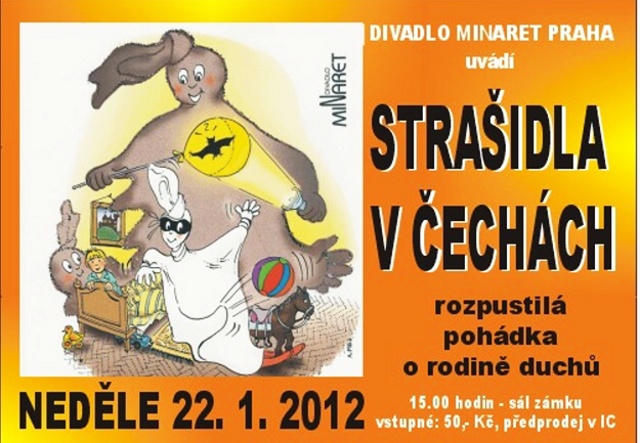 Divadlo Minaret Praha uvádí v neděli 22. ledna od 15 hodin v sále zámku pohádku o rodině duchů STRAŠIDLA V ČECHÁCH. Proč bludička věčně bloudí a láká poutníky svým mihotavým světýlkem? Co všechno dokáže provádět rarášek, aby člověka pořádně rozzlobil? Naučí se jedno polekané strašidýlko řádně strašit nebo se za úplňku rozplyne v mlhu? To vše se dozvíte v inscenaci, která je vhodná pro ty, kteří se nebojí, již od tří let (pro ty, kteří se bojí, až od čtyř let).