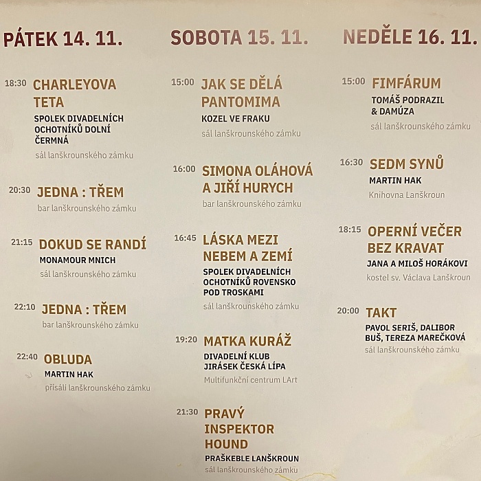 Třídenní amatérský divadelní festival Lathife letos nabídl čtrnáct vystoupení nejrůznějších žánrů. Nejčastěji činohry (4x), koncerty, storytelling, pantomimu, onewomen show, pohádku, operu i klauniádu.