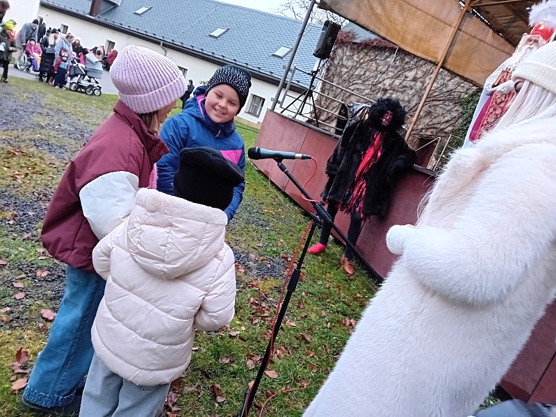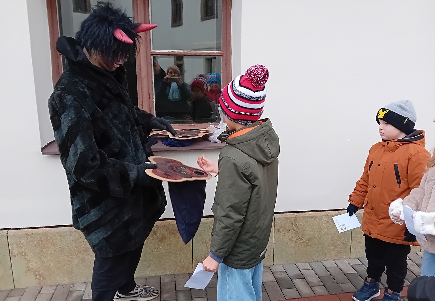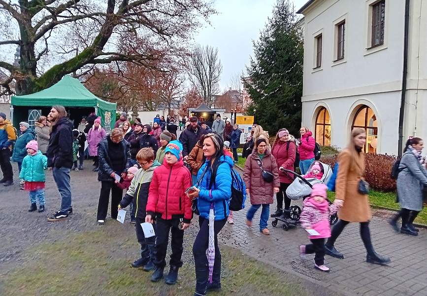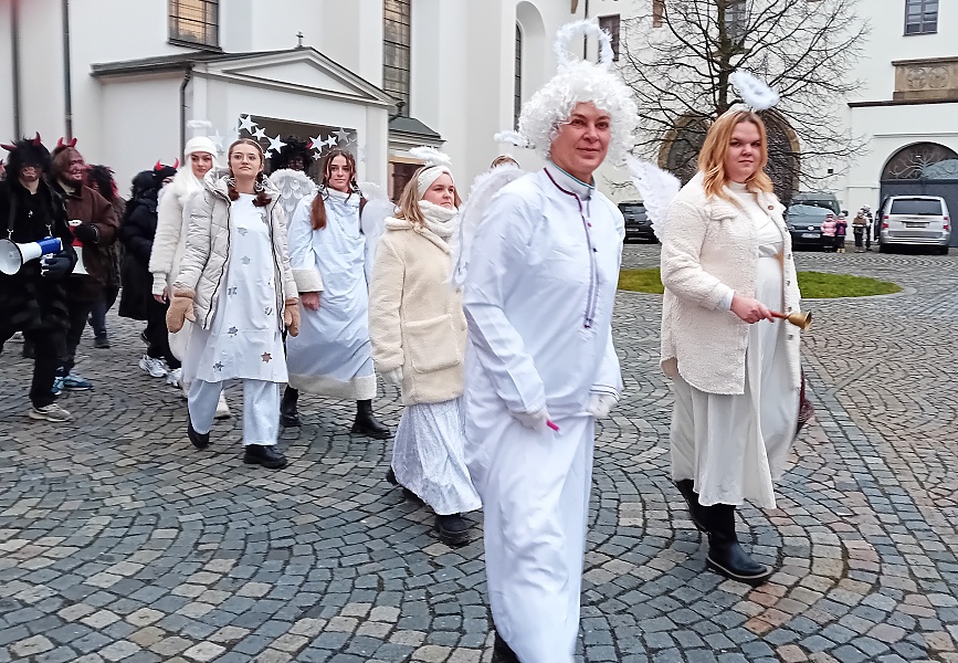 Tentokrát Mikuláš nepřijel ve voze taženém koňmi, ale celý mikulášský průvod s anděly i čerty se vynořil ze zadní části muzea, zamířil průchodem kolem kostela sv. Václava, přes náměstí A. Jiráska až na první nádvoří zámku.
