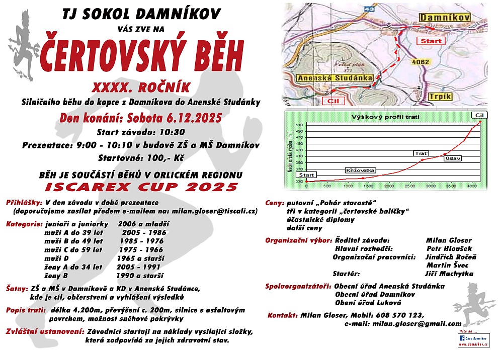 TJ Sokol Damníkov vás zve na XXXX. ročník Čertovského běhu - silniční běh do kopce z Damníkova do Anenské Studánky. Start závodu 10:30 hodin.