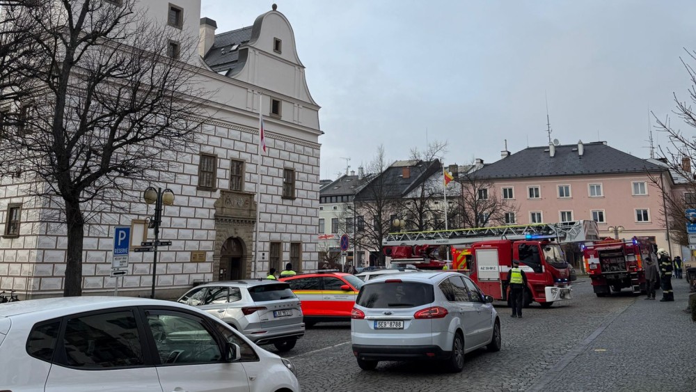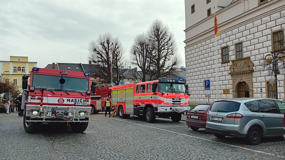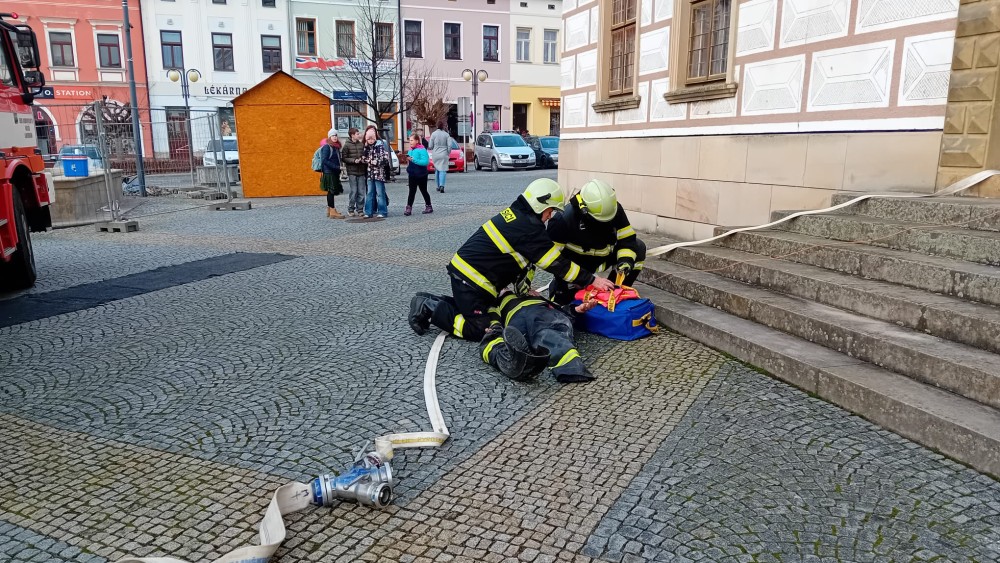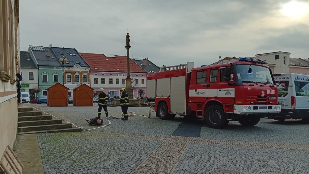 Na radnici probíhá za velkého zájmu přihlížejících hasičské cvičení. Podle informací města potrvá přibližně do 15 hodin.